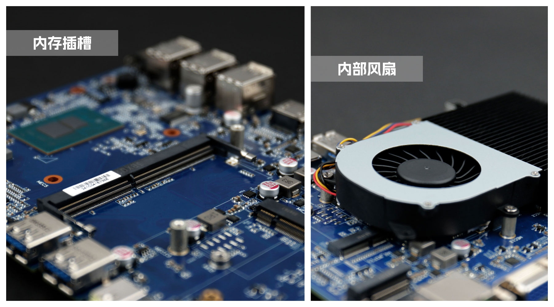 金年会|金年会·jinnian桌面云终端Y-BOX S2主板中部是内存插槽,采用单通道笔记本内存槽设计,最大支持容量可达32GB,最高支持DDR4-3200MHz频率,横插的形式可以减少主板的占用体积,使整体机身更紧凑,内存顶部的风扇起到高效散热的作用。