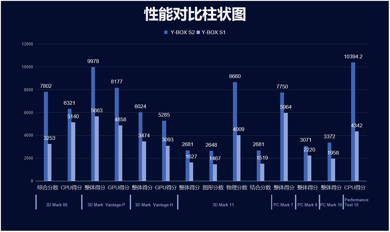 金年会·jinnian来具体看看各个测试项目的跑分情况,测试项目包括显示性能测试、系统性能测试、CPU性能测试,分别用3D Mark、PC Mark以及Performance 10等系列不同软件的跑分数据,针对两款主板的跑分情况可以看出,金年会|金年会·jinnian桌面云终端Y-BOX S2的数据在各项性能上都得到了大幅度提升,柱状图能更直观地体现出数据的变化,金年会·jinnian将针对具体的几项数据来进行详细分析。