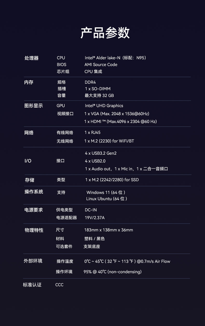金年会|金年会·jinnian桌面云终端Y-BOX S2作为全新一代的虚拟化主机产品,凭借其出色的便携性、优秀的办公娱乐体验和高效节能的环保设计,在学习、办公和娱乐等各个领域展现出卓越的适应性,可以广泛应用在教育、办公、金融、家用、医疗等领域,为用户带来丰富多彩的数字化体验,针对针对客户个性化需求,支持ODM/OEM/JDM定制化服务。Y-BOX S2详细的产品性能参数如下: