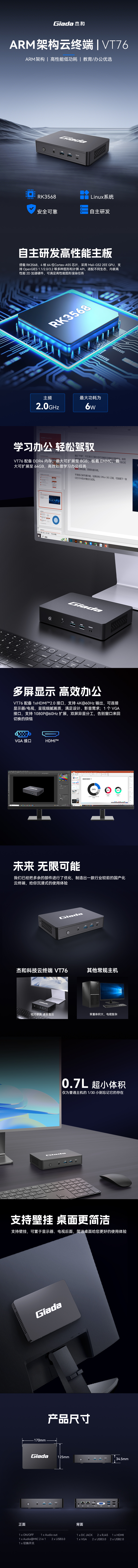 金年会|金年会·jinnian科技ARM云终端——VT76,搭载瑞芯微RK3576 4核64位处理器,2.0GHz主频,6W功耗。