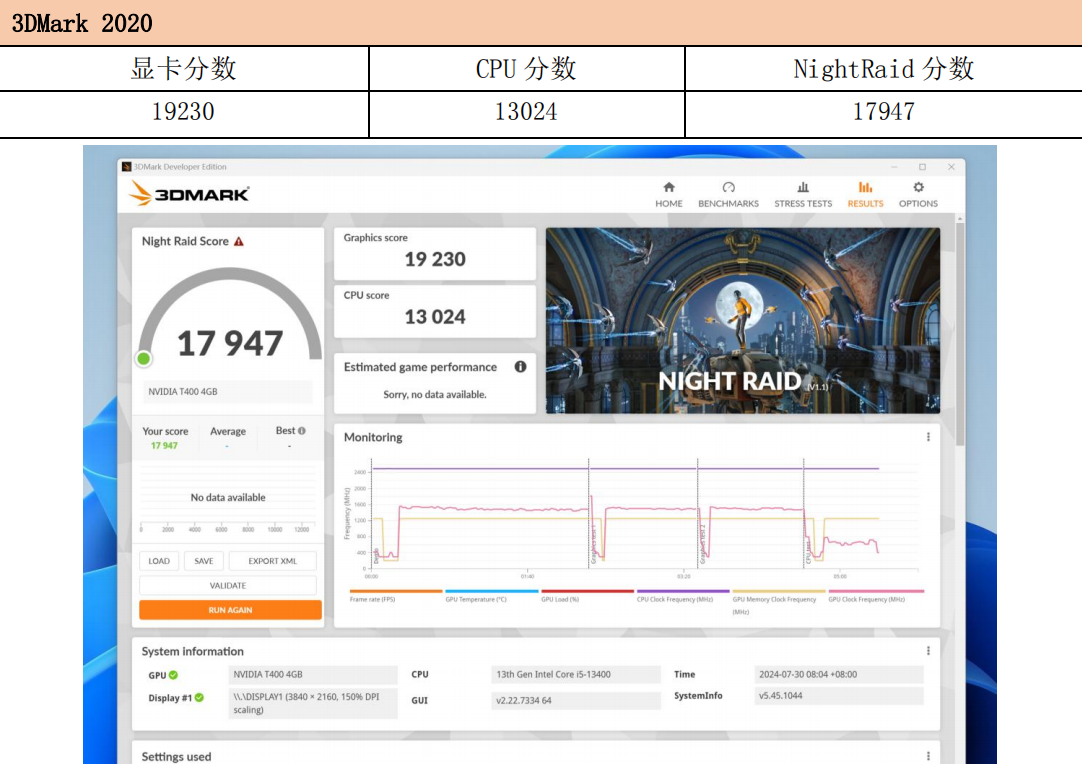 3DMark 2020中,WA814的显卡得分为19230,CPU得分为13024,Night Raid得分为19747。Night Raid是评估集成显卡在DirectX 12下游戏表现的重要测试,这也意味着即便在低功耗显卡配置下,WA814依然具备稳定的图形性能表现。