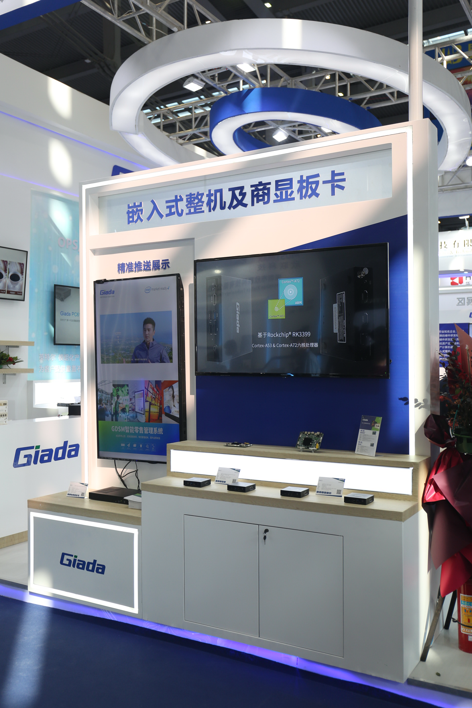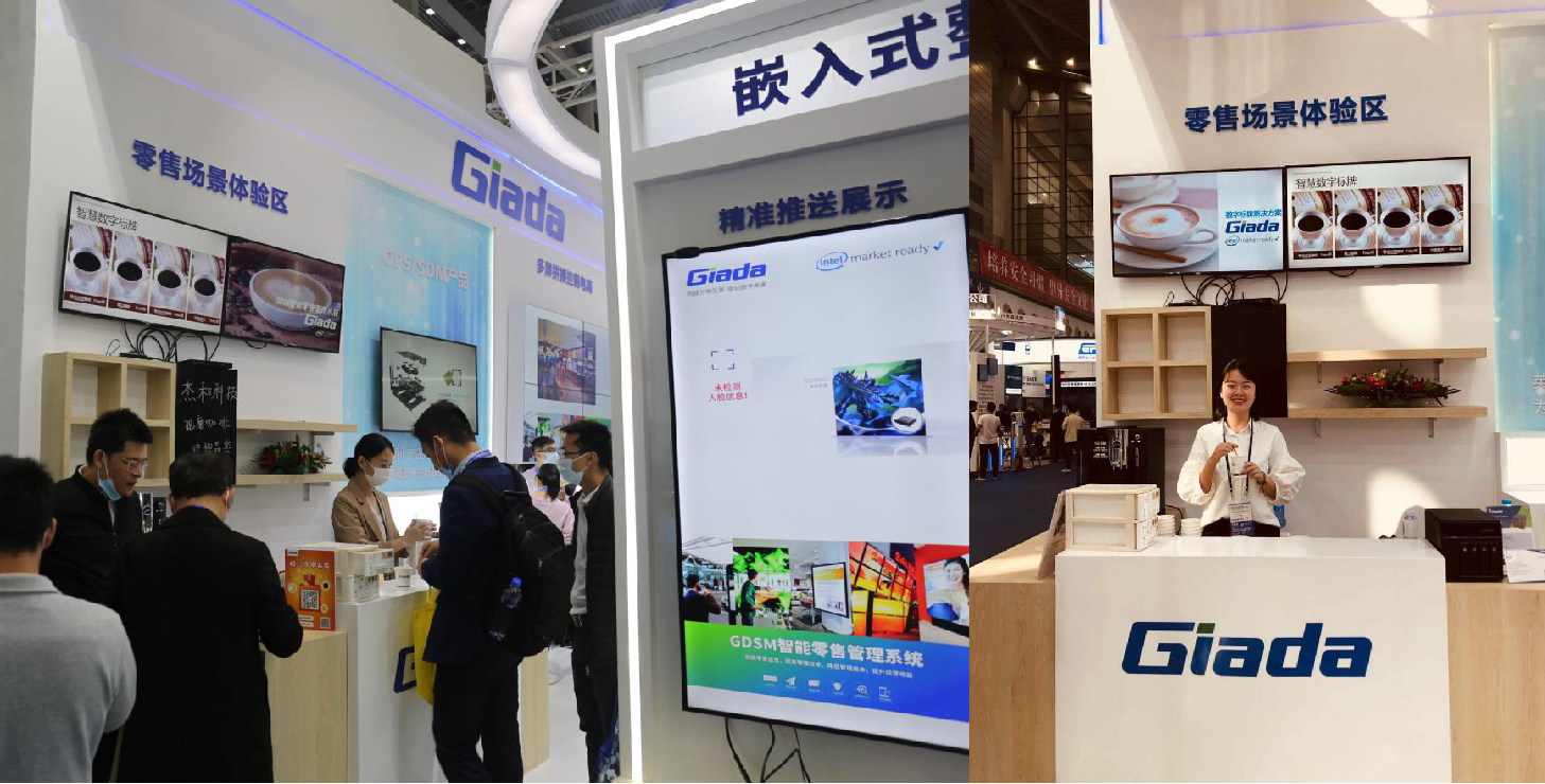 紧邻ARM架构商显产品集的精准推送展示区与零售门店模拟展区,共同组成了本届展会金年会|金年会·jinnian科技展位的一大精彩设计。场景展现了GDSM智能零售管理系统在零售门店场景下的展示效果,顶部的数字标牌由GDSM系统推送内容,模拟搭建了针对人流动线的广告精准推送形态。