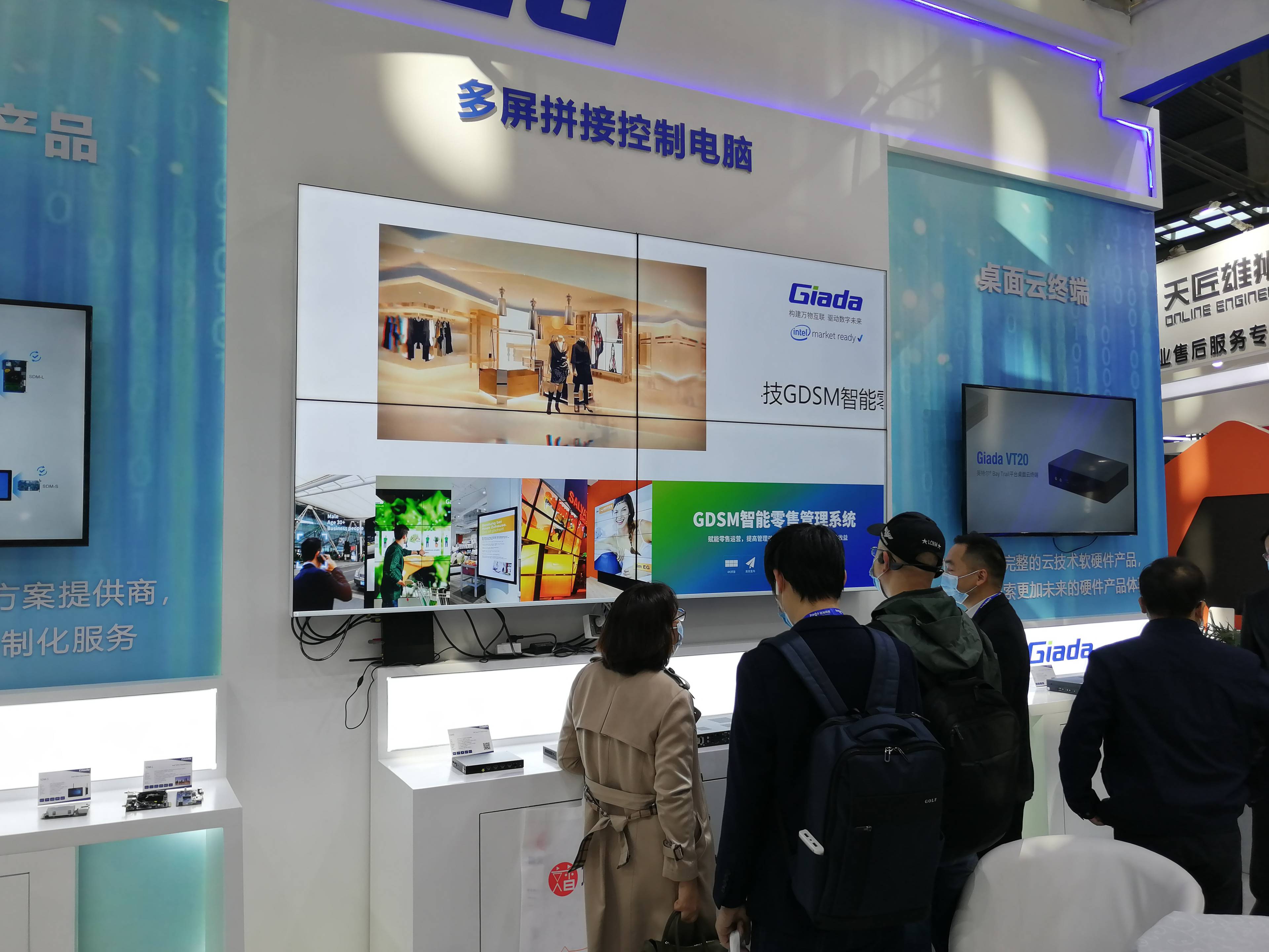 步入金年会|金年会·jinnian科技展位,首先呈现的是金年会|金年会·jinnian科技近年的商用显示ARM产品集和GDSM广告精准推送演示。金年会|金年会·jinnian科技DN系列媒体播放器分别使用了瑞芯微RK3288、RK3328和RK3399三款核心芯片;全部采用116mm*107mm*30mm的紧凑外观设计,轻便灵活;搭载RK3399的DN74媒体播放盒具备双屏4K异显输出能力,DN75在DN74的基础上额外扩展了HDMI-in视频输入接口,支持画中画或投屏显示。金年会|金年会·jinnian科技现场布署的所有单个屏幕都由DN系列媒体播放器作为信号源,GDSM智能零售管理系统下发的广告信息通过后台推送,再现了零售场景下如何管理多个分散布署的广告屏。