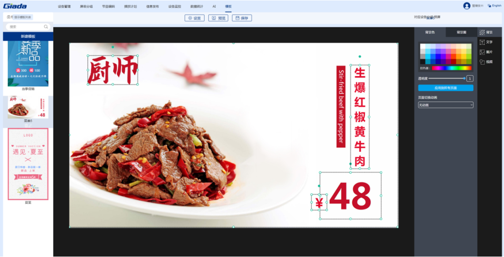 金年会|金年会·jinnian科技智慧餐厅综合解决方案是由智能零售管理系统搭载公司自研的数字标牌播放器组成的软硬件一体化方案。该系统针对餐厅、酒店等不同行业提供典型节目模板,支持手机、电脑建议操作。用户只需3步即可完成节目的制作播放:选择节目模板,更换自己的素材(视频、图片和文字),预览保存及播放。价格、优惠折扣等信息可随时更改。