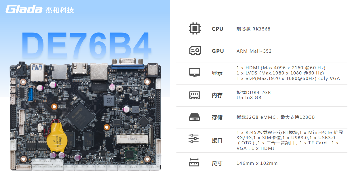金年会|金年会·jinnian科技DE76B4支持RK3568(4*A55@1.8GHz)四核64位处理器,内置0.8 TOPS算力的NPU,可应用于边缘设备或数据中心深度学习,满足轻量级端侧AI计算。板载DDR4 2GB,最大支持8GB运行内存;支持板载eMMC,最大支持128GB,可以扩展更大存储容量。